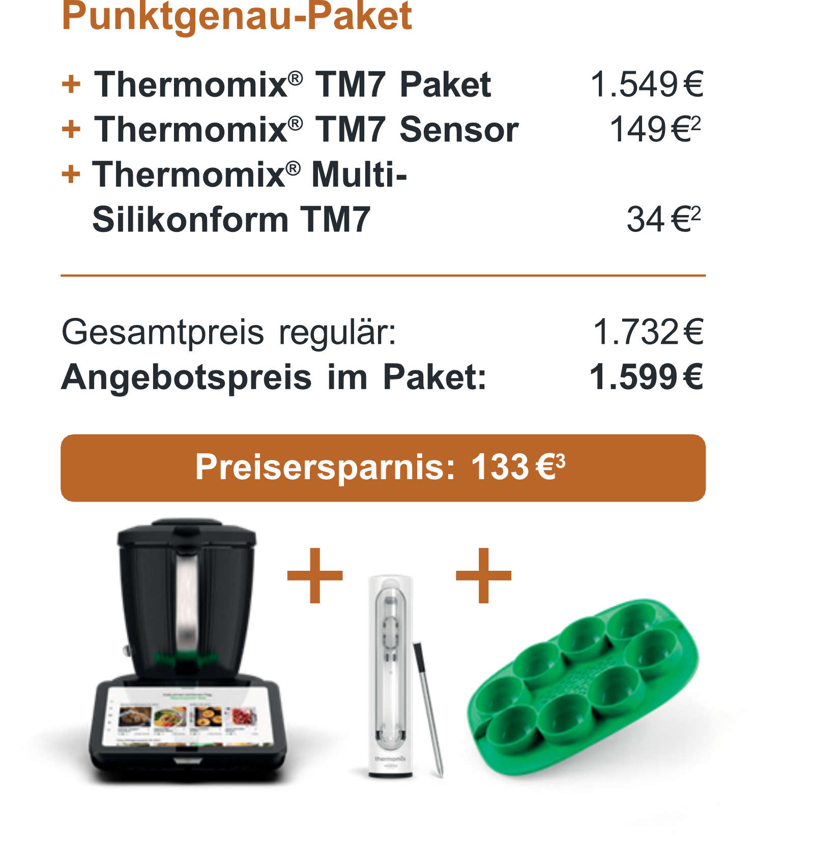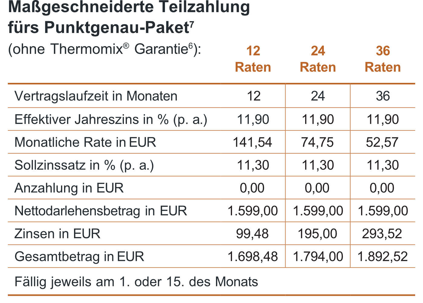 Beim optionalen Erwerb der Thermomix® Garantie (nicht teilzahlungsfähig) erfolgt eine separate Rechnungsstellung in Höhe von 149 €. Für das Punktgenau-Paket plus Garantie (Artikelnummer DE303158) ergibt sich so ein Gesamtpreis von 1.748 €.